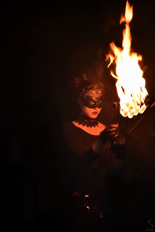 Používáme ohnivé rekvizity jako jsou velké svíce, ohnivé vějíře různých velikostí, oblíbené fire poi, fire hoop, fire swing sticks a další.